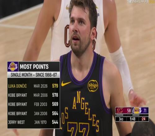 东契奇罚球命中,拿下3月份(当地时间)个人的第579分,超越科比(2006年3月的578分),成为湖人队史单月得分王。