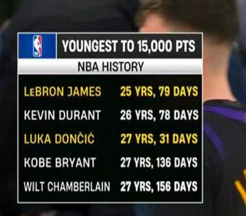 据统计,27岁31天的东契奇成为历史第三年轻的15000分先生,仅次于詹姆斯(25岁79天)和杜兰特(26岁78天)。